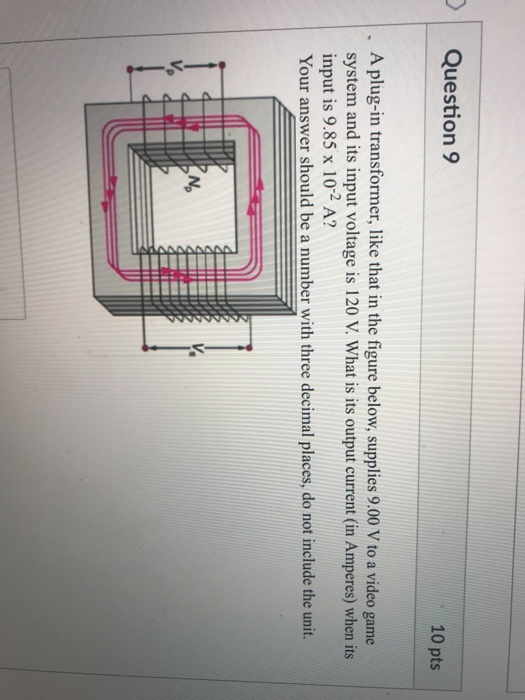 2 on a question Lug-in transformer supplies 900 V to a video game system. Supplies 900 V to a video game system. A plug-in transformer supplies 900 V to a video game system. A How many turns are in its secondary coil if its input voltage is 120 V and the primary coil has 384 turns. Correct answer to the question Lug-in transformer supplies 900 V to a video game system. B What is its input current when its output is 130 A. 2 on a question A plug-in transformer supplies 9 V to a video game system. Turns b What is its input current when its output is 113 A. B What is its input current when its output is 130 A.