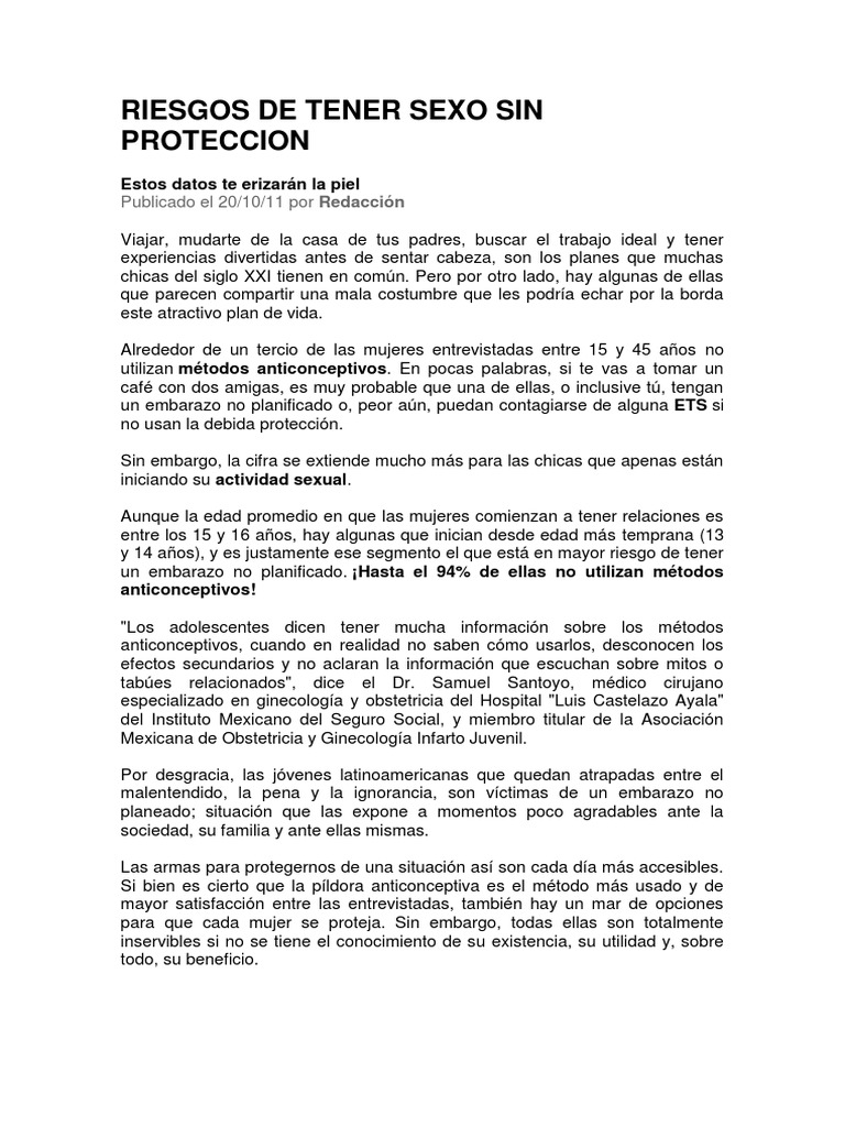 B adquirir una infección de transmisión sexual. En estos casos siempre debe hacerse una prueba de ETS. El pasado 30 de Abril tuve relaciones con mi esposo sin proteccion y psss el se vino dentro y hoy 02 de Mayo amanezco sangrando rojo digamos q el sangrado es un poco abundante pero no me duele nada ni me molesta al orinar ni nada solo sangro y ya como si estuviera en los dias de la regla lo que se me hace extraño es que cuando es la mestruacion. Relaciones sin protección tomando pastillas anticonceptivas Yasmin puedo estar embarazada. Las duchas vaginales cambian el equilibrio normal de hongos y bacterias en el tracto reproductivo lo que puede aumentar el riesgo de infecciones pélvicas y otras infecciones. Uno de los riesgos que corres al tener relaciones sexuales sin protección es. For specific medical advice diagnoses and treatment consult your doctor.